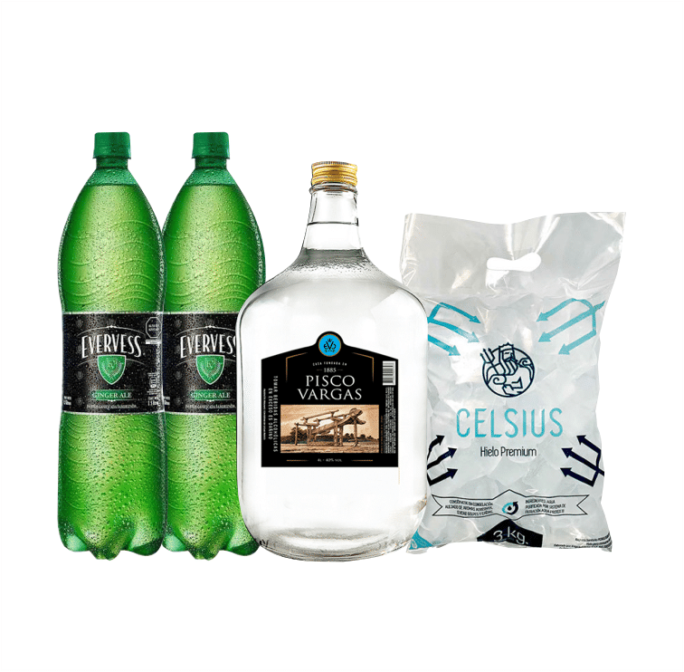 Combo perfecto para grandes celebraciones: Pisco Vargas 4 lt, 2 Evervess 1.5 L y Hielo 1.5 kg. Un pisco de calidad con el toque burbujeante de ginger ale, ideal para compartir en cualquier ocasión.